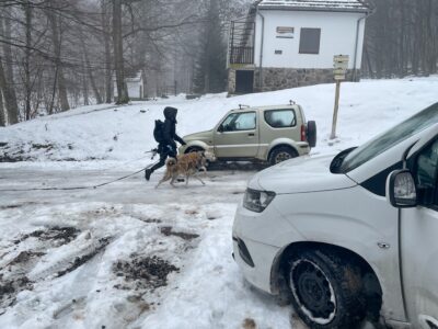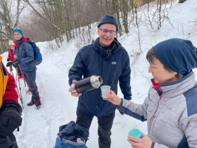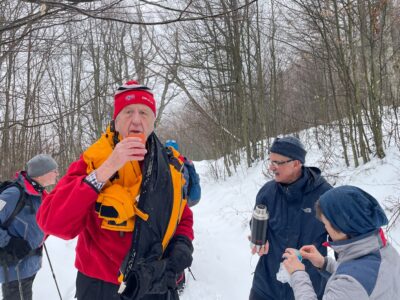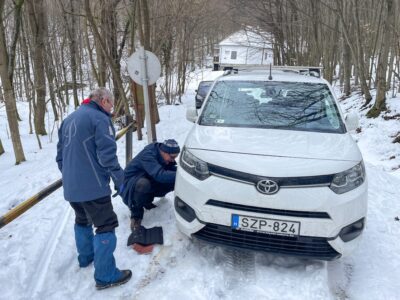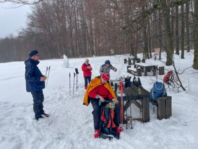 A hétüléses Toyota Pro Ace autó a mélyülő hóban hólánccal is csak kb. 500 m magasságig tudott feljutni az erdészeti úton. Onnan öten a Kék 4szög jelzésen gyalog indultak fölfelé. E sorok írója Mekli József tagtársunk, a Hegyi Mentőszolgálat tagja négykerék-meghajtású autójával följutott a 620 m szintre, ahonnan túrakötéses sílécével, fókával ért el a Foltán-kereszthez, útközben találkozva a társaság többi tagjával. A rétet jó 15 cm, olvadásnak indult hó borította. A vizes padok mellett „állófogadás” keretében megebédeltünk. Megosztottam barátaimmal azt a 116 éves igényt, hogy itt, ezen a gyönyörű réten, a Csóványos közelében, legyen egyszer legalább egy védkunyhó, a zordra forduló időjárás esetén. Még inkább kellene egy épület, ahol pihenni, étkezni is lehet. Királyrétről és Diósjenőről is el lehetne ezt látni az erdészeti utakon.