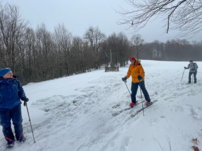 Szemerkélni kezdett az eső is, a fákról meg olvadt le a hó, késő is volt, hogy még 200 méterrel magasabbra, a Csóványosra eljussunk, ezért visszafordultunk. Hatan gyalog, én sível. A hó vizes volt, jóval lassabb, mint reggel volt, a kulcsos ház fölött már igen vékony. Ami az előző napon alig tíz perc lesiklás lett volna, abból lett vagy 25, csöndes esőben. Jó volt az eresz alá állni a kulcsosház verandáján, amíg társaim a két autóval megérkeztek.