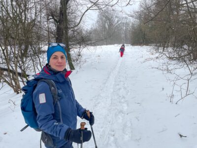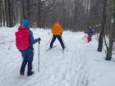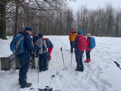 A MTE Börzsöny- és Sí Osztálya által meghirdetett emléktúrát és lesiklást a melegre fordult időjárás miatt egy héttel elhalasztva, február 22-én terveztük megtartani. Az előző napokra várt nagyobb havazásból jóval kevesebb lett, már fölmerült a túra lemondása, de Gyurka Botond barátunk szombati transzbörzsöny túráján mégis szép havat talált a Magas-Börzsönyben, ezért az Osztály kemény magja, hét elszánt ember, vasárnap reggel nekivágott az útnak. Noha az éjszakai fagy reggel 10-re Királyréten már plusz 4-5 fokra váltott, de a szénpataki kulcsosháznál még közel 20 cm, olvadni kezdő havat találtunk. Az erdészeti úton a sorompó fölött autónyom még nem volt, és sínyomot is csak az az öttagú csapat hagyott, akikkel a sorompónál találkoztuk, ők már lefelé siklottak a még gyors havon.